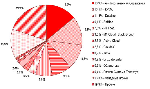 Крупнейшие игроки рынка IaaS по итогам 2015 г. – компании «Ай-Теко», КРОК, Dataline, Softline и «ИТ-Град», на долю которых приходится более 55% всей выручки от услуг IaaS в публичных и гибридных облаках. Причем компании, вошедшие в тройку лидеров по выручке от услуг IaaS, располагают собственными дата-центрами и на их базе разворачивают виртуальные площадки.