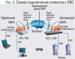 При реорганизации отдела – выведении его за штат и преобразовании в сервисную компанию – учитывалась специфика работы этой службы. К примеру, в обязанности сервисных инженеров входит обслуживание и обеспечение бесперебойной работы кабельных систем, оргтехники и аппаратной части ЛВС. Постоянного присутствия специалиста в офисе требуют также производство и ремонт кабельных патч-кордов, перенос оборудования, поддержка копировальной техники и т.п. Поэтому и при аутсорсинге обслуживания в компании все же предусмотрена штатная должность сервисного инженера (впрочем, самая низкооплачиваемая), либо сервисная компания предоставляет своего специалиста для работы на площадке заказчика. Рассмотрим ситуацию, когда ИT аутсорсер управляет сетевыми устройствами и серверами предприятия по зашифрованному (AES 256 байт) каналу VPN. Управляющее подключение – по протоколам RDP (для WINсистем), SSH (для nix-систем и сетевых устройств), HTTP(S) и SNMP (для сетевых устройств). Сетевое подключение – на базе оборудования DFL200 (D-Link), которое устанавливается у клиента и работает в качестве VPN-сервера (рис. 3).