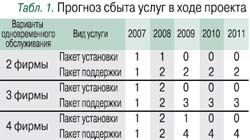 Кроме того, выбранная бизнес-модель позволяет сервисной компании работать одновременно с несколькими заказчиками, что принципиально важно, поскольку обслуживание единственного клиента убыточно (на это однозначно указывает соотношение показателей ФОТ специалистов-участников проекта и общей стоимости оказанных ими услуг). Прогноз сбыта в течение операционного периода производился для каждого пакета услуг (табл. 1).