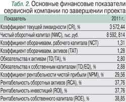 Итоговые финансовые показатели, имеющие значение индикаторов ликвидности, устойчивости, рентабельности и деловой активности сервисной компании (табл. 2), говорят о ее устойчивом положении и благоприятных перспективах развития (особенно высокое значение ROE, которое характеризует доходность бизнеса). Поскольку инвестиционная привлекательность проекта прежде всего определяется его способностью генерировать денежные потоки, полученный чистый приведенный доход (NPV) в размере 9,8 млн руб. при общем объеме капитальных затрат на весь проект 2,6 млн руб. говорит сам за себя.