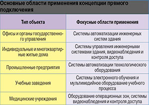 Концепция прямого подключения может использоваться в самых разных сферах применения СКС (см. таблицу), причем за счет больших объемов подключаемого сетевого оборудования ее реализация улучшает технико-экономическую эффективность кабельной системы в целом.