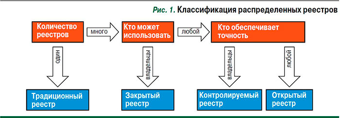В отчете «Технология распределенного реестра и ее применение в платежах, безналичных расчетах и заключении сделок», выпущенном Федеральной резервной системой США в декабре 2016 г., дается следующее определение: «В строгом понимании распределенный реестр – это тип базы данных, которая распределяется среди узлов в сети. В системе DLT узлами являются устройства, работающие на специальном программном обеспечении и совместно поддерживающие записи базы данных. В такой структуре узлы соединены друг с другом, чтобы распределять и подтверждать информацию». Как видно из рис. 1, существует несколько типов распределенных реестров.