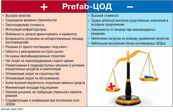 К достоинствам prefab-ЦОДов большинство опрошенных «ИКС» экспертов отнесли скорость возведения объекта. Преимущество достигается за счет распараллеливания производственных процессов. На заводе собираются prefab-модули, а в это же время на месте готовится площадка для установки конструкций. Еще больше заметен выигрыш в случае стандартных микроЦОДов. Не надо строить серверную, рассчитывать перемещение потоков воздуха, размещать кондиционеры – достаточно установить готовый шкаф с предварительно подготовленными инженерными системами и обеспечить отвод тепла. Дополнительный плюс – использование шкафов с интегрированной на заводе инженерной инфраструктурой позволяет повысить утилизацию площади дата-центра.