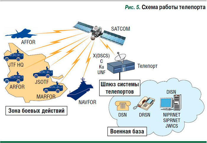3. Система телепортов. Телепорт является телекоммуникационным пунктом сбора и распределения информации, который обеспечивает боевые подразделения широкополосным, мультимедийным и глобальным доступом к DISN. По замыслу разработчиков, эта система должна поддерживать связь между солдатом на поле боя, экипажем в боевой технике и командованием. Телепорты через космос соединяют наземные сети DSN, DRSN, NIPRNET, SIPRNET с пользователями в зоне боевых действий (рис. 5). Данная система будет осуществлять интеграцию и контроль множества коммуникационных интерфейсов, обеспечивающих связь наземного сегмента DISN Пентагона с группировкой спутников связи. Телепорты приходят на смену прежним шлюзам STEP (Standard tactical entry point). Один телепорт заменяет 15 шлюзов STEP.