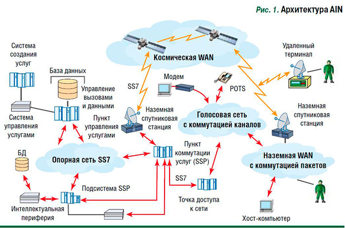 Пользователями AIN могут быть как абоненты сети коммутации каналов, так и сети коммутации пакетов. Заметим, что интеллектуальная сеть имеет и транспортируемую часть (на рис. 1 слева внизу). Например, во время войны в Афганистане для обслуживания развернутых там войск самолетом привезли телефонную станцию с функциями SSP/Adjunct, оборудование интеллектуальной периферии и базу данных.