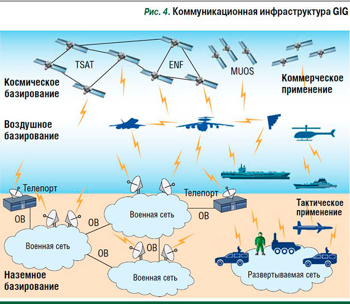 2. Космический сегмент. Эта программа подразумевает строительство перспективной объединенной системы спутниковой связи, базовыми компонентами которой станут пять группировок космических аппаратов связи: АEHF (Advanced Extremely High Frequency); система узкополосной спутниковой связи MUOS (Mobile User Objective System) – наиболее массовая часть сегмента; WGS (Wideband Global Satcom) для вооруженных сил в зонах Тихого, Атлантического и Индийского океанов; система связи на полярных орбитах EPS (Enhanced Polar System). К 2030 г. возможно создание новой группировки спутников TSAT (Transformational Satellite), задуманной для широкополосной спутниковой связи с использованием межспутниковых каналов лазерной связи. Спутники TSAT – наиболее амбициозная часть космического сегмента GIG.