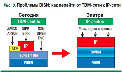 Перевод сети DISN на IР-протокол (рис. 3) – мероприятие чрезвычайно сложное и дорогое. Помимо перехода от TDM-кодирования на IР-пакеты предусмотрена и модернизация кабельной сети – переход от режима SONET/TDM к спектральному уплотнению каналов DWDM.