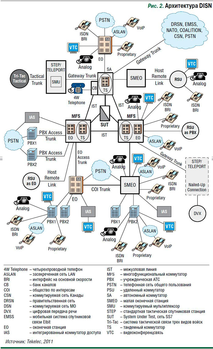 В 2011 г. компания Tekelec проводила тестирование сети SS7 в составе DISN. Соединения на этой оборонной сети устанавливаются при помощи сигнализации SS7, т.е. в «сердцевине» сети находится сеть SS7 в полном объеме, а на периферии используются различные устройства любого типа (рис. 2). В основном это IР-оборудование (телефоны для четырехпроводных каналов, VoIP или ISDN BRI, устройства видеоконференцсвязи и т.д.), которое может подключаться по любым протоколам, включая нестандартные (proprietary).