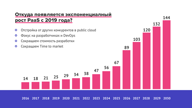- Когда вопросы с ресурсной частью, OPEX, CAPEX и гибкостью будут закрыты, поставщики сфокусируются на эффективности работы разработчиков и DevOps, что повлияет на рост PaaS.