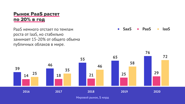 Сегмент PaaS-сервисов пока меньше своих собратьев, но тем не менее неплохо развивается. Он растет – по 20% в год – и стабильно занимает 15–20% рынка публичных облаков.