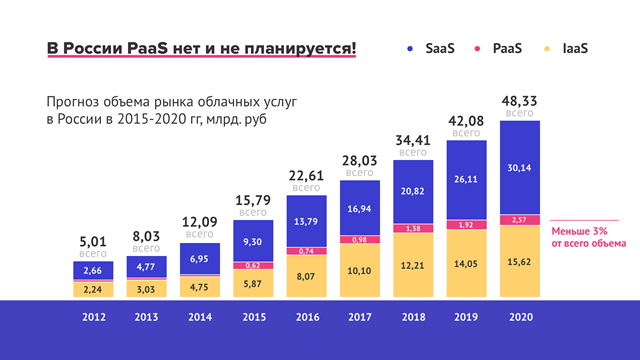 Возможно, проблема в том, что в России недостаточно знают о преимуществах PaaS, и если приложить усилия к популяризации этих сервисов и к просвещению ИT-сообщества, то можно добиться такого же роста, как в IaaS-сегменте. Экономия, которую компании-разработчики могут получить за счет использования PaaS-платформ, поможет существенно развить ИT-инфраструктуру и ИT-культуру в России в целом.