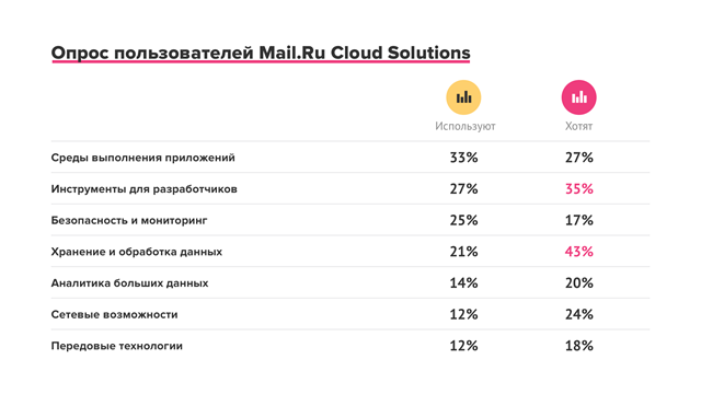 Сервисы используют 43% зарубежных разработчиков (по данным Amazon) и 25% россиян (по информации Mail.Ru Group). 17% ими интересуются.