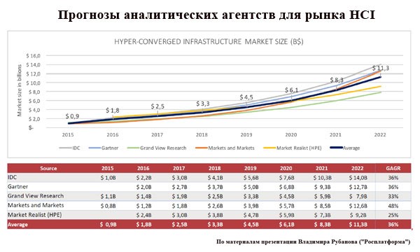 Аналитики предсказывают гиперконвергентным системам большое будущее. Согласно прогнозу MarketsandMarkets , к 2022 году рынок гиперконвергентных инфраструктур достигнет $12 607,4 млн при среднегодовом темпе роста 43,59%.