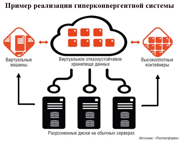 Следующий шаг – развернуть платформу виртуализации на интегрированных блоках или серверах, объединив в единое целое их внутренние диски/дисковые полки на программном уровне, таким образом формируя виртуальное отказоустойчивое хранилище. С точки зрения наращивания вычислительных мощностей получающиеся гиперконвергентные инфраструктуры (HCI – Hyper-Converged Infrastructure) уже не ограничены возможностями одного интегрированного модуля устройства или сервера – платформа объединяет их ресурсы в единое целое, из которого можно нарезать нужные для конкретной задачи вычислительные мощности.