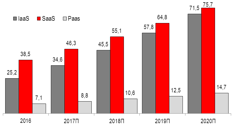 Рис. 1. Доли основных типов облачных сервисов на рынке России