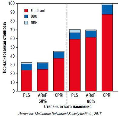 Рассмотрим подробнее структуру стоимости системы 5G RAN. Подсистема Fronthaul может быть построена разными способами: например, с использованием CPRI или двух различных вариантов распределения функций цифровой обработки сигнала между RRH и BBU. Вариант PLS (Physical Layer Split) предполагает перенос в RRH функций цифровой обработки для MIMO, а вариант ARoF (Analog Radio over Fiber), напротив, – перенос всех функций цифровой обработки в BBU (в том числе функции аналого-цифрового преобразования и цифровых функций предискажения сигнала для максимизации линейного диапазона усиления). Расчеты стоимости сети 5G RAN с учетом инсталляционных работ, сделанные для разной степени охвата населения (50% и 90%), показывают (рис. 3), что на долю Fronthaul приходится более 70% всех затрат. Следовательно, Fronthaul не может рассматриваться как «составная часть» базовой станции и является в централизованной сети 5G RAN самостоятельным ключевым сетевым доменом.