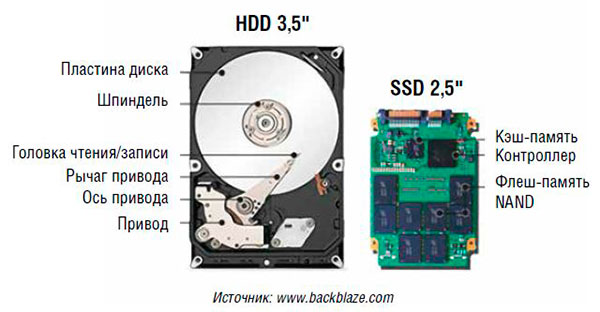 | Рис. 1. Основные компоненты HDD и SSD |