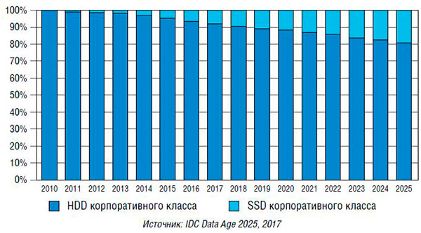 Накопители с более высокой емкостью обеспечивают большую плотность хранения, уменьшают расходы за счет менее частого обслуживания и снижения энергопотребления. В настоящее время в ЦОДах используются диски емкостью до 10–12 Тбайт. SSD сопоставимой емкости обойдутся примерно в $1000 за 1 Тбайт, т.е. значительно дороже соответствующего жесткого диска. Стоимость SSD еще не достигла того уровня, который сделал бы их применение безусловно выгодным с учетом предоставляемых преимуществ, поэтому можно предположить, что в ближайшем будущем в качестве основных накопителей будут использоваться жесткие диски. По данным IDC, более 90% поставок накопителей корпоративного класса сегодня приходится на HDD. К 2025 г. доля SSD составит почти 20% объема поставок (рис. 2).