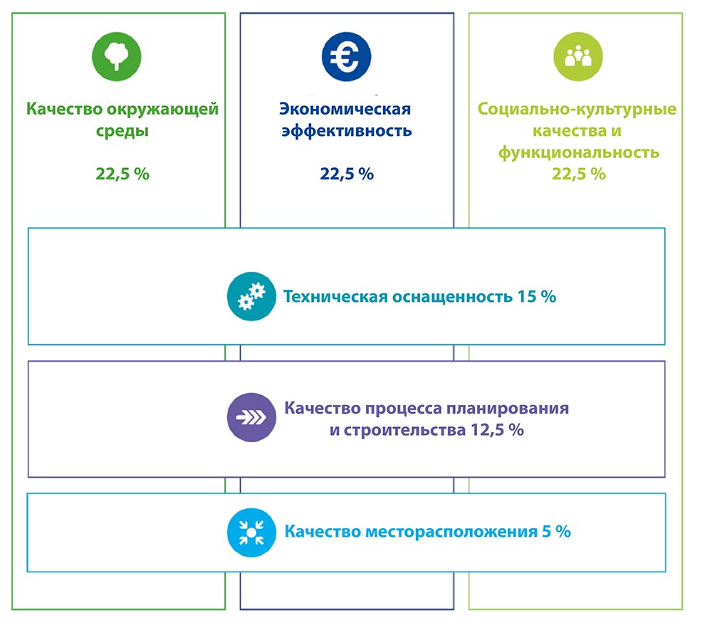 Система DGNB содержит 37 критериев, разделенных на шесть групп: