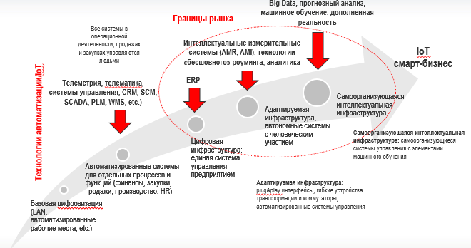 Интернет вещей – это следующий этап эволюции решений автоматизации бизнес-процессов с вовлечением физических объектов. Эволюция идет от аналоговой инфраструктуры сначала к цифровой, потом к адаптивной и позже к самоорганизующейся (рис. 2). Большинство бизнес-процессов в каждой отрасли уникально, а значит, уникальны и отраслевые IoT-решения. Поэтому рынок интернета вещей имеет ярко выраженную отраслевую специфику. Но и внутри отрасли присутствует множество разных технологических решений, которые решают разные бизнес-задачи конкретного потребителя. Например, есть разные типы транспорта -- общественный наземный, железнодорожный пассажирский, легковой автотранспорт, коммерческий автомобильный грузовой и т.д. Каждый тип транспорта имеет свою специфику, которая учитывается в отраслевом решении. Более того, специфика информационной транспортной системы (ИТС) определяется также типом потребителя, на которого направлен сервис. Например, город решает задачи управления дорожным движением, пассажирам нужны сервисы навигации и информация о движении общественного транспорта, собственникам автопарка – возможности мониторинга и управления водителями и транспортными средствами и т.д. (табл. 1).