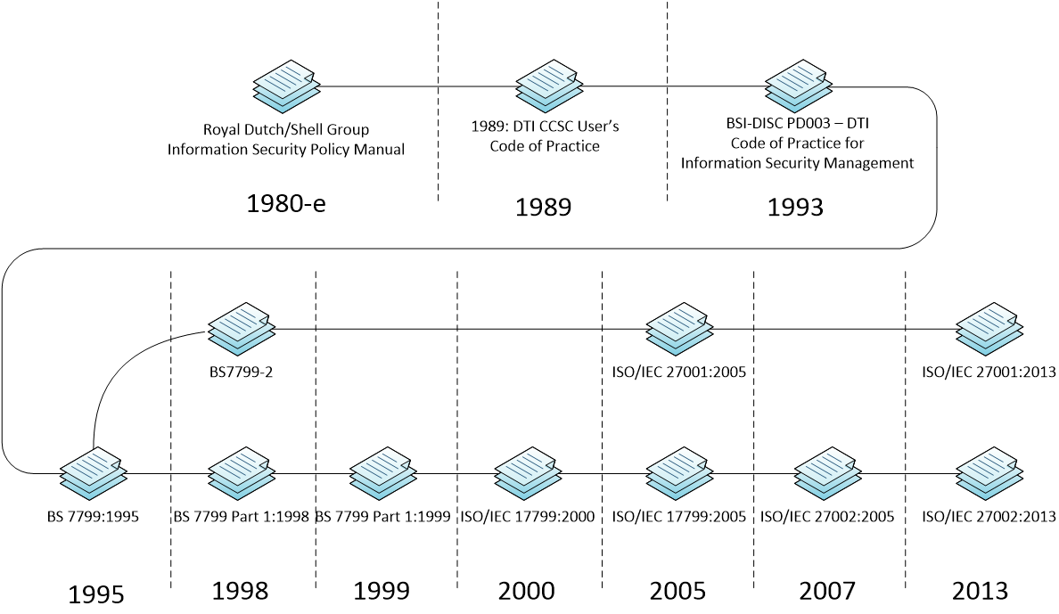 Стандарт ISO/IEC 27001 по праву считается наиболее концептуальным и комплексным. Его история началась в 80-х годах прошлого века, когда Центр компьютерной безопасности Департамента торговли и индустрии Великобритании опубликовал рекомендации DTI CCSC User’s Code of Practice. Документ был разработан на основе политики информационной безопасности компании Royal Dutch Shell (ныне Shell). Он представлял собой перечень ключевых мер информационной безопасности, которым необходимо было следовать при работе с корпоративными мэйнфреймами. В 1993 году документ был доработан и опубликован Британским институтом стандартов (British Standards Institute, BSI) под названием Code of Practice for Information Security Management. Результатом дальнейшей доработки документа BSI стал изданный в 1995 году британский национальный стандарт BS 7799:1995, содержавший актуализированный перечень рекомендуемых для применения в организациях мер защиты информации. Однако выбор оптимальных для конкретной организации мер защиты информации оставался за рамками стандарта. Для решения этой проблемы в 1998 году BSI разработал стандарт-дополнение – BS 7799 Part 2:1998. Именно его можно считать прямым предшественником стандарта ISO/IEC 27001.