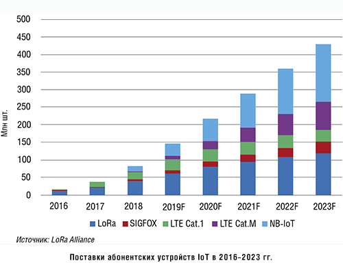 Таким образом, несмотря на возможный быстрый рост технологии NB-IoT, конкурирующей с LoRaWAN, последняя, по мнению аналитиков, и в перспективе сохранит значимую долю мирового рынка, что подтверждает прогноз поставок абонентских устройств IoT (рис. 1).