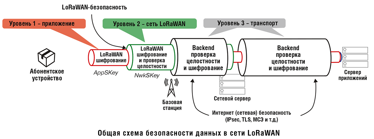 В сети IoT LoRaWAN используется многоуровневая система безопасности передачи данных (рис. 4):