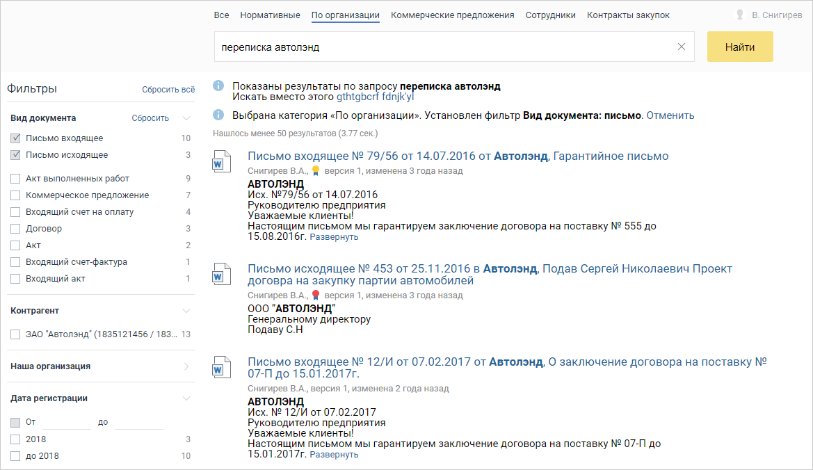 - исправление опечаток и неправильной раскладки клавиатуры при вводе запроса, подсказки по истории запросов и наименованиям общедоступных документов, работа с фильтрами;