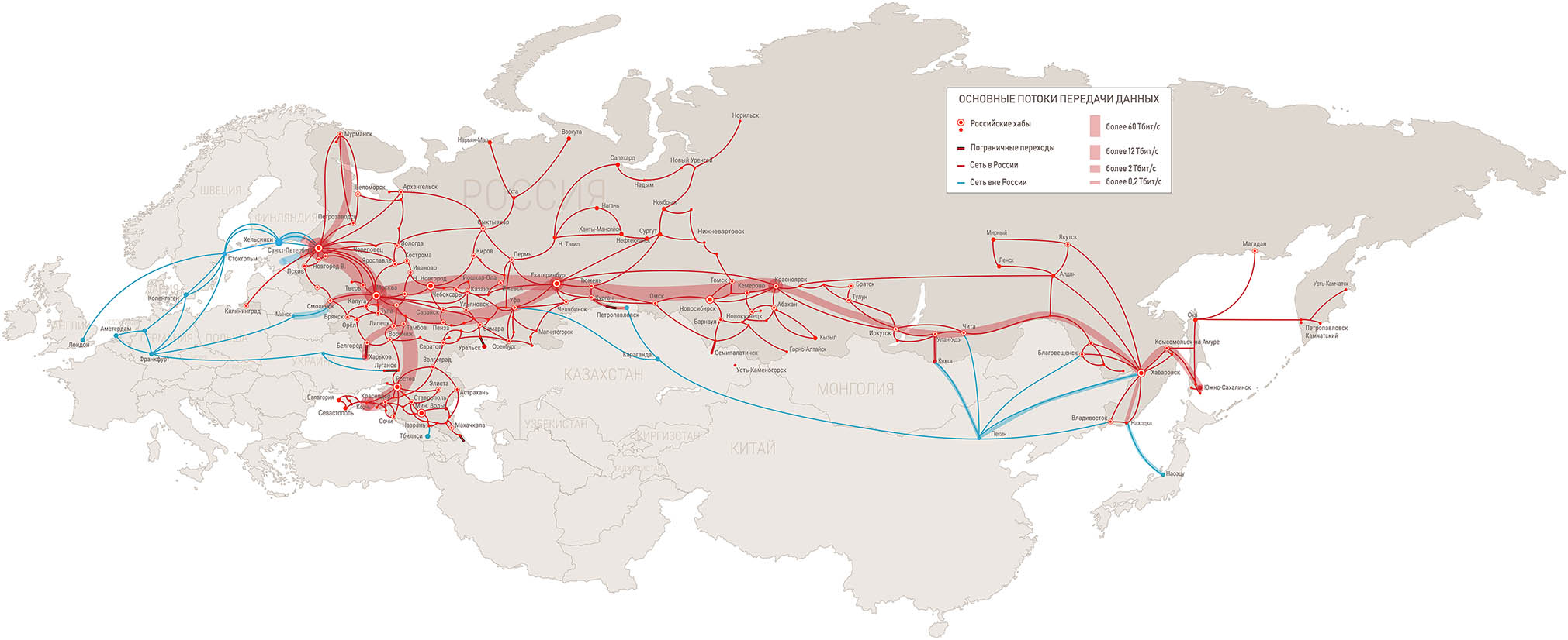 Несмотря на огромные расстояния и относительно низкую плотность населения, в настоящее время в России построена разветвленная оптическая сеть с множественным резервированием маршрутов, охватывающая практически всю территорию страны с запада на восток. Пропускная способность этой сети на направлении Москва – Санкт-Петербург превышает 60 Тбит/с, Москва –Хабаровск – 10 Тбит/с, а еще на восьми направлениях – 2 Тбит/с (рис. 2). Задержки в этой сети определяются в первую очередь географической удаленностью объектов. Существенный и относительно легко – благодаря возможностям технологий плотного спектрального уплотнения (DWDM) – расширяемый запас пропускной способности позволяет минимизировать джиттер и потери пакетов. При этом Сочи, город в 2014 г. принимавший Олимпиаду, подключен к сети каналами с общей пропускной способностью 680 Гбит/с, а каналы Ростов -- Керчь и Анапа -- Керчь обеспечивают в общей сложности скорость 12 Тбит/с: магистрали построены с заметным запасом, в надежде на быстрое экономическое развитие Крыма, в котором с 2015 г. действуют свободные экономические зоны, а в 2018 г. принято решение о создании ИТ-парка в Севастополе.