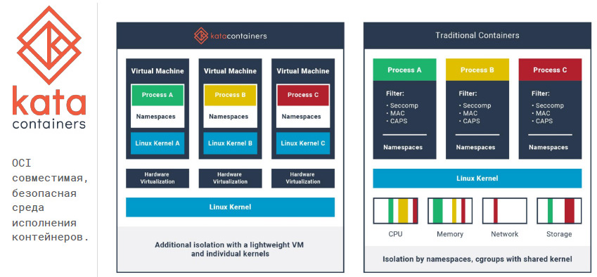 Перспективным выглядит проект Kata Contаiners. Разрабатываемые в его рамках решения можно рассматривать как легковесные виртуальные машины, которые обладают преимуществами контейнеров и при этом за счет изоляции рабочих нагрузок обеспечивают безопасность уровня виртуальных машин.