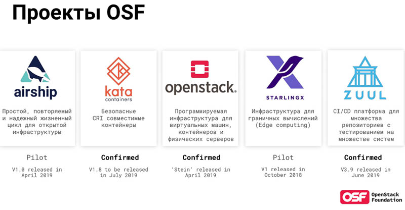 В экосистему OpenStack входят продукты с открытым исходным кодом: платформа виртуализации сетевых функций Open Platform for NFV, набор ПО для управления виртуализацией Libvirt. На слуху также гипервизор KVM, оркестратор Kubernetes, контейнеры Docker и свободная программная объектная сеть хранения Ceph. Сегодня OSF помимо давшего названия сообществу продукта ведет четыре дополнительных проекта: Airship, Kata Containers, StarlingX и Zuul.