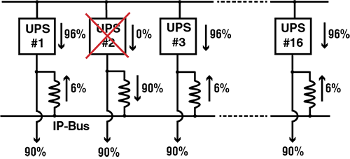 В отличие от «прямой» параллельной конфигурации, в системе IP-Bus каждая установка ИБП управляет своим напряжением на выходе независимо от других – отсутствует централизованное устройство управления и исключается общая точка отказа. Если предположить, что поток мощности от одного ИБП по какой-либо причине внезапно пропадает, его нагрузка остается подключенной к IP-Bus с помощью IP-дросселя, который теперь работает в качестве резервного источника питания. При таком сценарии нагрузка будет автоматически и бесперебойно получать питание из шины IP-Bus (см. рис. 3).
