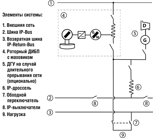 Система IP-Bus состоит из нескольких установок ИБП, количество которых определяется заданным уровнем резервирования N + x и включает следующие основные компоненты: ИБП с устройством накопления энергии, IP-дроссель для подключения установки ИБП к IP-шине и выключатели, необходимые для безопасной работы системы. На рис. 6 показан один из вариантов системы IP-Bus на базе роторного ИБП.