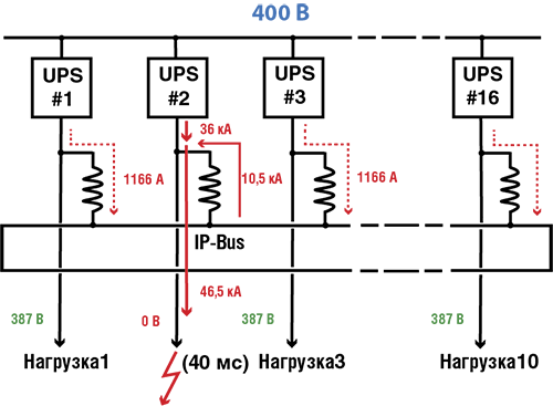Статические ИБП с аккумуляторными батареями имеют ограниченные возможности мгновенно отдавать и принимать большие токи, а кроме того, токи КЗ самих ИБП относительно невысоки. По этим причинам решения IP-Bus на статических ИБП – это скорее эксперименты, и в действующих ЦОДах они практически не встречаются.