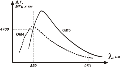 | Рис. 3. Спектральные характеристики многомодовых волокон категории ОМ4 и ОМ5 в первом окне прозрачности |