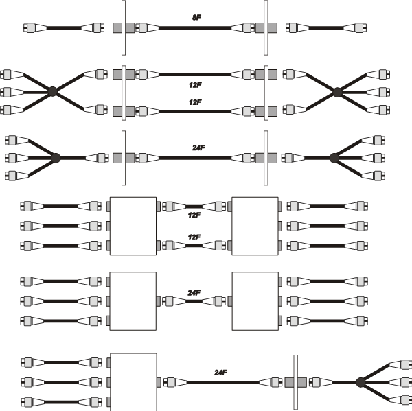Пространственное уплотнение SW использует одну длину волны, все субканалы работают по разным волокнам. Число световодов кратно 8 или 12. В зависимости от их количества для линии применяют обозначения Base8, Base12, Base16, Base24 и Base32. В последнее время системы Base8 и Base16, в которых естественным образом для передачи полностью задействуются все волокна ленточного кабеля, заметно теснят остальные варианты. Для улучшения экономических показателей трактов на основе 12- и 24-волоконной ленты обычно применяются адаптеры в корпусном и/или шнуровом исполнении (рис. 2).