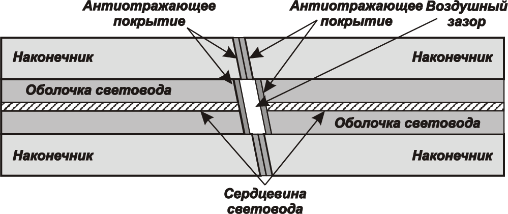 Для подавления обратных отражений можно воспользоваться антиотражающими покрытиями. Их установка также делает ненужным наличие прямого физического контакта торцов волокон или заменяющих их элементов в собранном разъеме, что существенно замедляет деградацию соединителя по обратным отражениям в процессе эксплуатации линии связи. Впервые такое решение было представлено в середине текущего десятилетия американской компанией Arrayed Fiberoptics, а схему реализующего ее соединителя демонстрирует рис. 5.