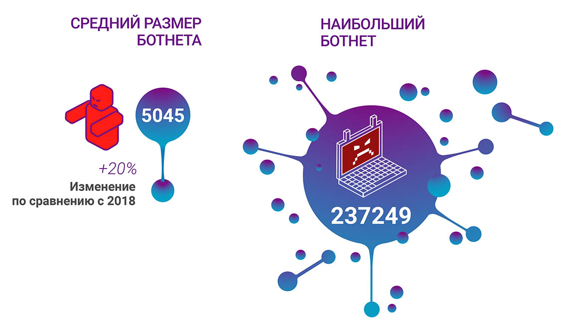 Средний размер управляемой преступниками сети (ботнета) вырос на 20%. Во многом это обусловлено использованием устройств с не обновляемым ПО, например, старых мобильных телефонов, и с распространением интернета вещей.