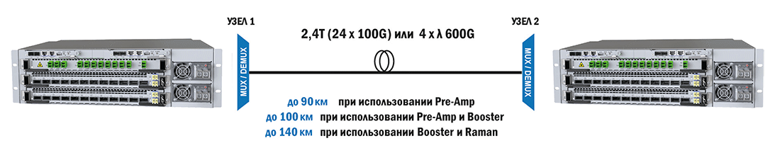 Новая компактная трехъюнитовая система «Волга» V3-DCI (COMPACT), разработанная «Т8», предназначена в первую очередь для соединений между ЦОДами. Достоинства модели – увеличенная втрое по сравнению с предыдущим поколением скорость передачи данных (до 600 Гбит/c на канал) и компактность, благодаря чему она занимает минимум места в дата-центре: на одной плате размещены восьмиканальный DWDM-мультиплексор/демультиплексор, усилитель и мультиплексор служебного канала. Пропускная способность трехъюнитовой системы достигает 2,4 Тбит/с на расстоянии до 100 км. Задействуются четыре длины волны, каждая из которых обеспечивает скорость 600 Гбит/с. Если у заказчика высокие требования к скорости, то максимальная емкость передачи по одной паре волокон может достигать 28,8 Тбит. Для этого необходимо использовать несколько таких систем и мультиплексор на 48 каналов. Высокоскоростная, многофункциональная система «три-в-одном» в компактном корпусе допускает каскадное соединение.