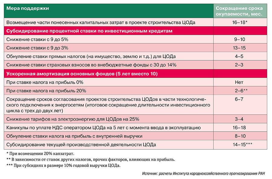 Возможные меры господдержки инвестиционной активности и их влияние на сроки окупаемости проектов коммерческих ЦОДов
