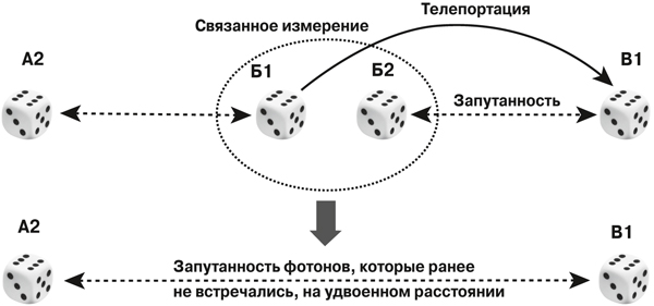 Если у Боба есть фотон Б2, запутанный с фотоном Вики (В1), то при проведении Бобом связного измерения Б1 и Б2 образуется запутанность на еще большем расстоянии, причем между никогда не встречавшимися фотонами А2 и В1, и появляется возможность телепортировать A1 в B1 и далее (рис. 6). Передается форма, а не материя, так что фундаментальный закон, ограничивающий перемещение скоростью света, не нарушается.