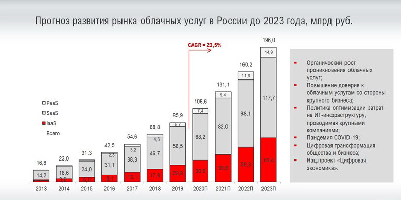 Помимо пандемии на рост российского облачного оказывают влияние процессы цифровой трансформации общества и бизнеса, национальный проект «Цифровая экономика». Эксперты iKS-Consulting прогнозируют, что российский рынок облачных услуг к 2023 г. вырастет в 2,3 раза до 196 млрд руб. Рынок будет увеличиваться не менее чем на 23% ежегодно, при этом ожидается, что отдельные сегменты будут прирастать на 30–31% в год.