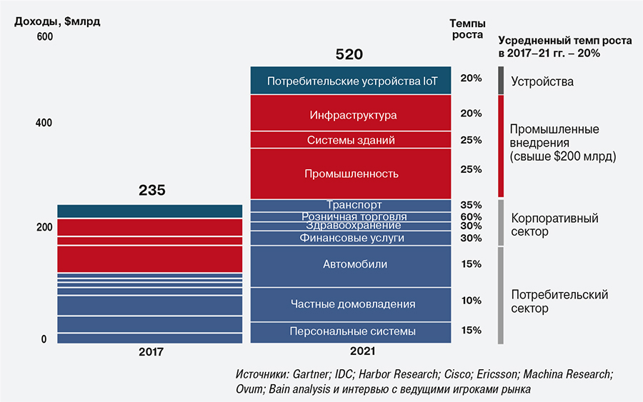 Рис. 3. Доходы от поставок решений IoT и средств аналитики по сегментам рынка