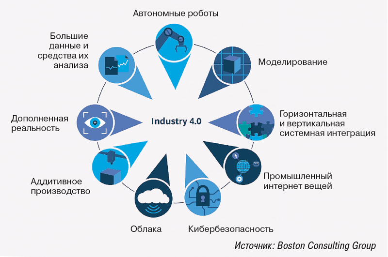 Аналитики Boston Consulting Group рассматривают большие данные и методы их анализа в качестве важнейших технологий индустриальной трансформации, к которым они относят также промышленный интернет, решения на базе автономных роботов, моделирование, горизонтальную и вертикальную интеграцию, кибербезопасность, дополненную реальность и аддитивное производство (рис. 2). Последнее использует цифровые модели и системы генеративного дизайна, позволяющие передавать ИТ-платформам часть функций проектирования. В Deloitte добавляют к этому искусственный интеллект, машинное обучение и когнитивные системы.