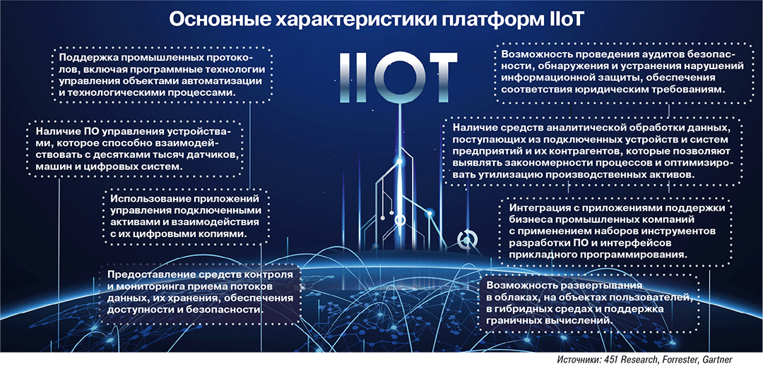 Цифровизация на основе промышленного интернета открывает доступ к значительным объемам массивов производственных данных, поступающих из различных источников: установленных в цехах датчиков, АСУ ТП, хранилищ информации приложений управления, включая ERP (Enterprise Resource Planning), MES (Manufacturing Execution System), и ряда других систем. Их обработка ИТ-ресурсами, предоставляемыми комплексами IIoT, дает возможность формировать технологические и принимать управленческие решения, которые способны заметно повысить продуктивность промышленных компаний.