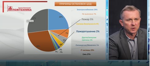 Перебои в энергоснабжении – одна из основных причин остановки ЦОДа (24% остановок, по оценкам, которые приводит ГК «Пожтехника»). Но не стоит забывать и о других причинах. Например, о пожаре (5%) или ложном срабатывании систем пожаротушения (2%).