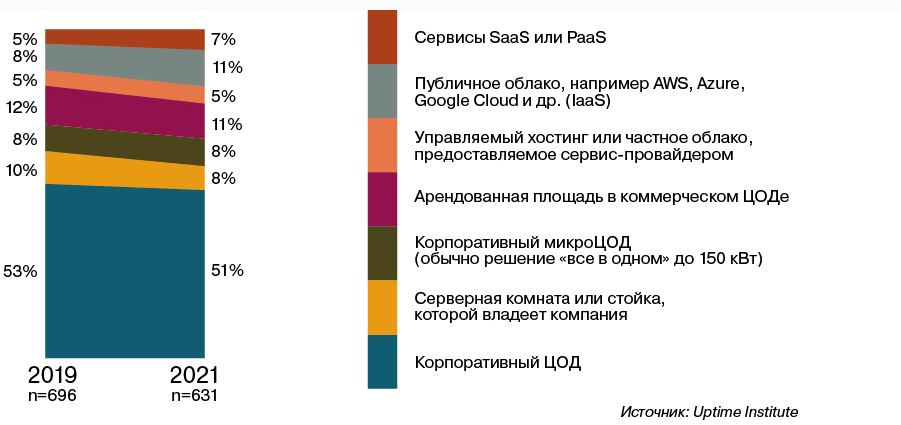 Несмотря на то что все больше корпоративных информационных систем переходят на colocation и управляемые сервисы (в том числе облачные), корпоративные ЦОДы не исчезнут. Опросив более 600 ИТ-менеджеров и менеджеров ЦОДов, эксперты Uptime Institute выяснили, что в 2021 г. около половины всех рабочих нагрузок по-прежнему будут находиться в корпоративных центрах обработки данных, и только 18% – в публичных облаках, в том числе SaaS (рис. 2).