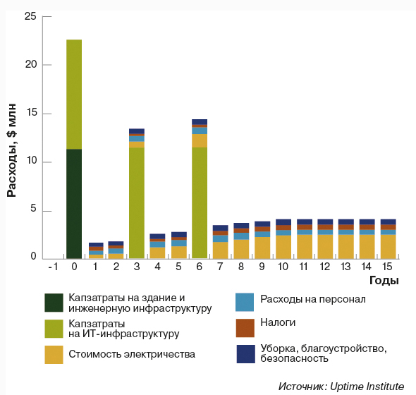 Рис. 1. Стоимость владения типичным корпоративным ЦОДом мощностью 3 МВт при горизонте планирования 15 лет