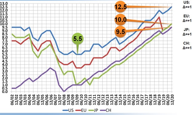 Рис. 1. Отставание России по сумме Rmax от США (US), Евросоюза (EU), Китая (CH) и Японии (JP), годы