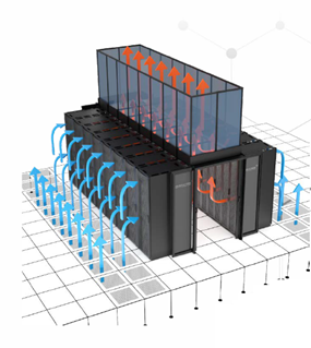 Третий вариант – изоляция с отводом воздуха над шкафами – применяется только для горячих коридоров. Может использоваться как при наличии фальшпола, так и при его отсутствии. Потолочные панели не перекрывают верхнюю плоскость коридора, а образуют канал для отвода горячего воздуха в систему воздухоотвода или за фальшпотолок. В этом случае большая часть помещения превращается в огромный резервуар кондиционированного (холодного) воздуха, что упрощает поддержание необходимого температурного режима для отдельно стоящего негабаритного ИТ-оборудования.